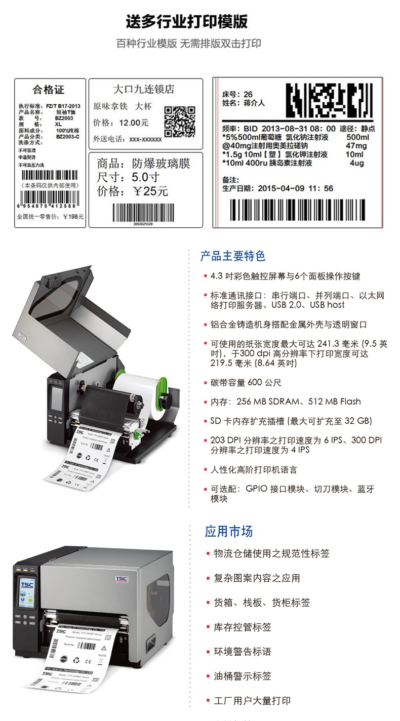 TSC有30多個(gè)系列,近百個(gè)機(jī)型的專業(yè)條形碼打印產(chǎn)品,種類涉及桌面型、工業(yè)型、便攜型、列印模組以及彩色打印,是目前所有品牌中產(chǎn)品較為齊全的制造廠商,可滿足各種行業(yè)的使用需求。