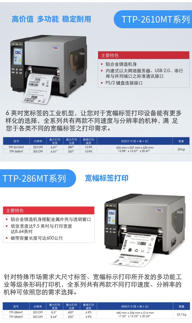 TSC有30多個(gè)系列,近百個(gè)機(jī)型的專業(yè)條形碼打印產(chǎn)品,種類涉及桌面型、工業(yè)型、便攜型、列印模組以及彩色打印,是目前所有品牌中產(chǎn)品較為齊全的制造廠商,可滿足各種行業(yè)的使用需求。